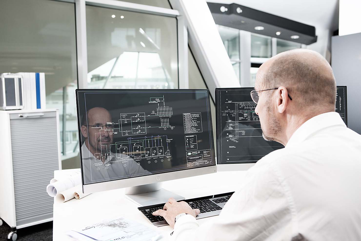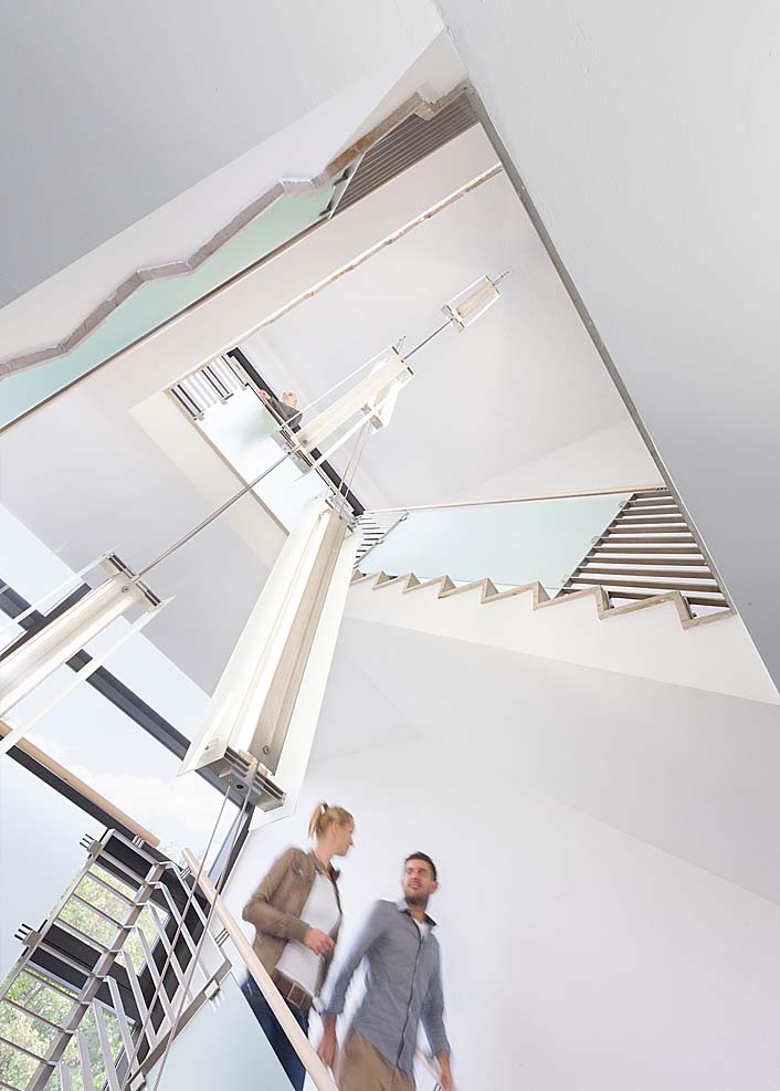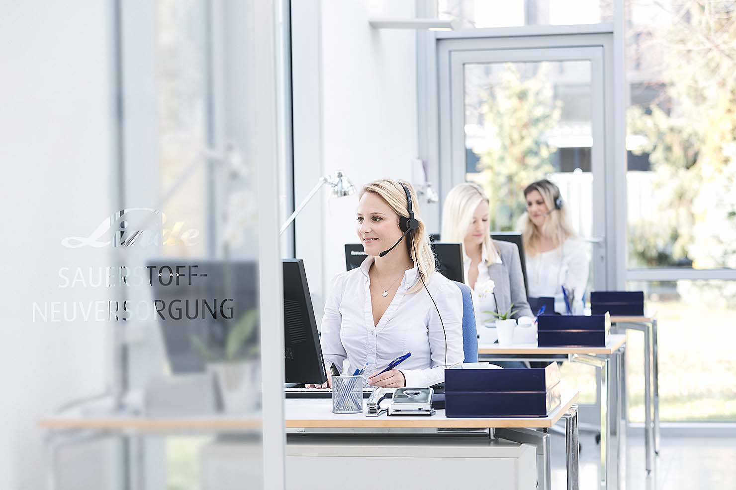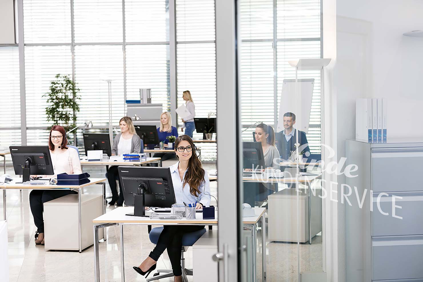 Interessant war die fotografische Umsetzung der Großraumbüros, die komplett in angemieteten leeren Räumen von Stylistin Nicole Hannay in glaubhafte Service-Center gestylt wurden.